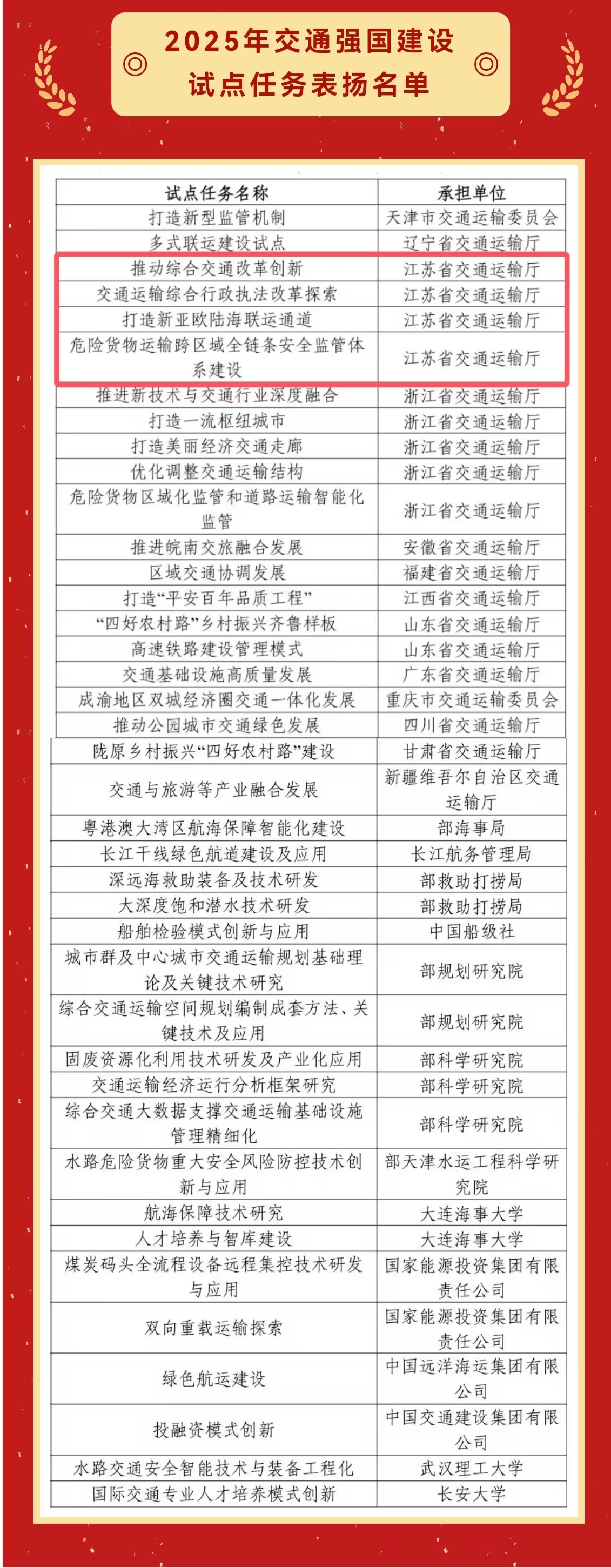 交通运输部从2025年7月底前完成验收评估的87项试点任务中,综合评价任务实施效果、创新引领水平及推广应用情况等因素,决定对浙江省交通运输厅“推进新技术与交通行业深度融合”、江苏省交通运输厅“推动综合交通改革创新”、山东省交通运输厅“高速铁路建设管理模式”等40项试点任务进行表扬。