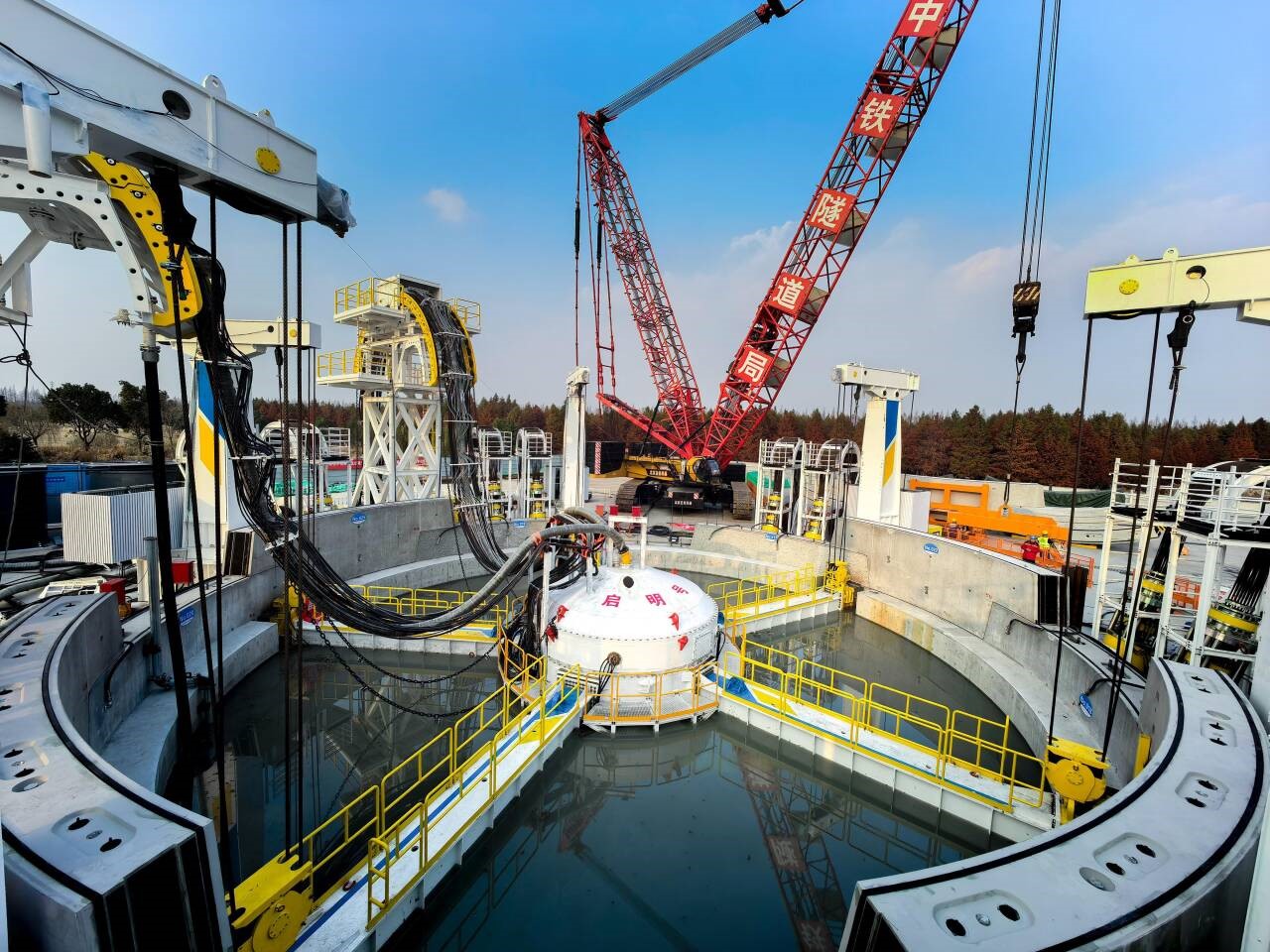 崇太长江隧道全长14.25千米,设有竖井3座。其中,由“启明号”完成的2号竖井地处太仓市浮桥镇,是“领航号”盾构机接收与再始发的核心要地。该竖井距离长江南岸大堤200米,直径24米,为临江漫滩超深富水、预制装配式圆形竖井。