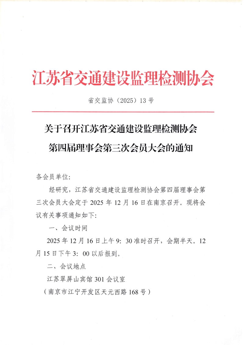 江苏省交通运输厅门户网站 协会动态 关于召开江苏省交通建设监理检测协会第四届理事会第三次会员大会的通知-k8凯发天生赢家